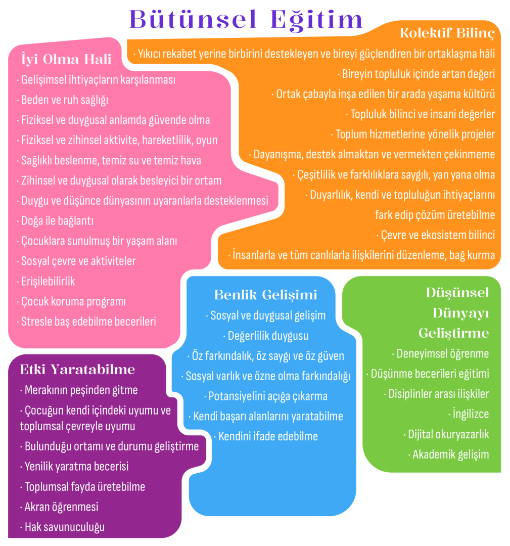 Eğitimi; sağlık, hareketlilik ve yaşamla birlikte çocuğun bütünsel iyi olma hâlinin ayrılmaz bir parçası olarak görüyoruz. Bu nedenle eğitim sürecinin; zihinsel, sosyal, duygusal ve akademik gelişimi bir arada kapsaması gerektiğine inanıyoruz.