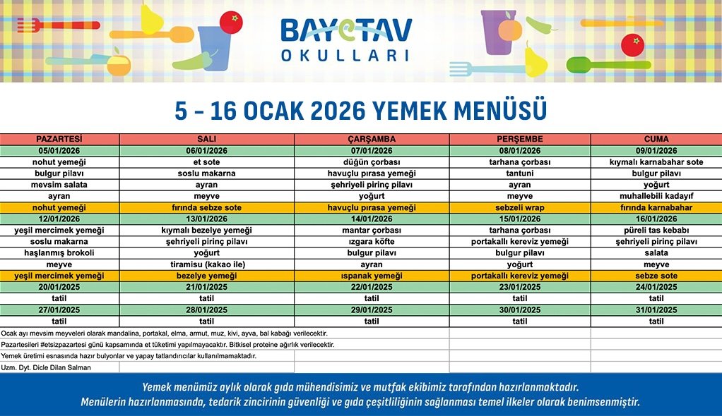 BAYETAV Okulları 5–16 Ocak 2026 tarihleri arasındaki yemek menüsünü ve Ocak ayına ait mevsim sebze ve meyvelerini içeren bilgilendirici posterimizi sizlerle paylaşıyoruz.